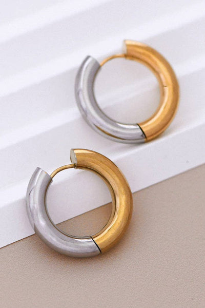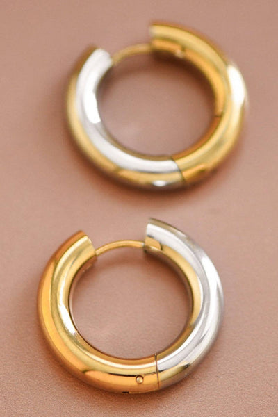 18K Gold Dipped Stainless Steel Chunky Closed Hoop Earrings in Two-tone. Approx. 0.95"L These earrings are hypoallergenic, waterproof and tarnish-resistant. *To prolong the shine and finish of the plating, contact with chemicals such as lotions, perfumes, and cleaning products should be avoided.*